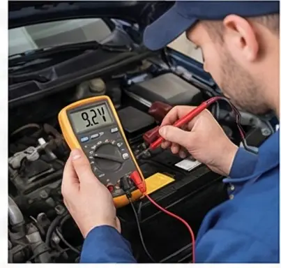 정비소에서 전압 측정기로 확인할 수 있어요. 시동을 건 상태에서 정상 전압은 **13.6~14.2V**이고, 시동을 끈 후 측정했을 때 **9.5V 이하**면 교체가 필요합니다.