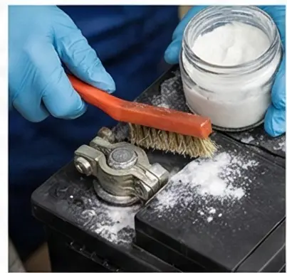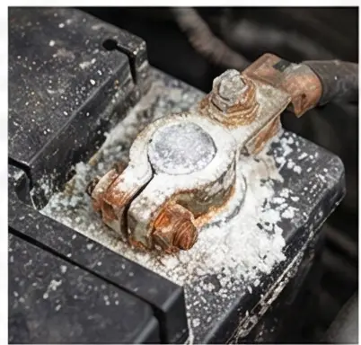 배터리 단자 주변에 **하얀 가루**가 쌓여 있다면 부식된 상태예요. 이것은 황산 가스와 납이 반응해 생긴 부식물로, 접촉 불량을 일으켜 방전의 원인이 됩니다.