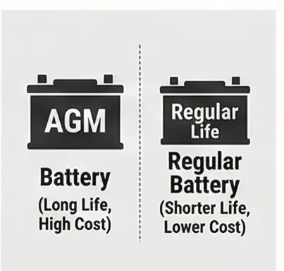 AGM 배터리는 일반 납산 배터리보다 수명이 2배 이상 길고(6~7년), 방전 저항성이 높아요. 다만 가격이 2배 정도 비쌉니다(20~50만원). 신차나 수입차에 많이 사용돼요.
