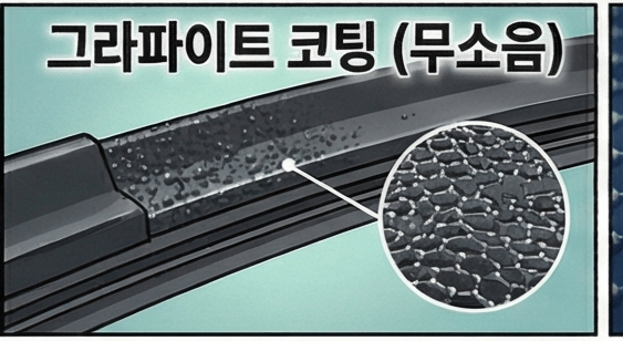 고무 블레이드에 그라파이트 코팅이 되어 있어 움직임이 부드럽고 소음이 거의 없습니다. 일반 와이퍼보다 훨씬 매끄럽게 작동해요.
