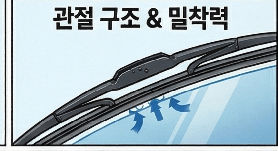 일반 와이퍼처럼 관절 구조로 유리면에 고른 압력을 주면서도, 플랫 와이퍼처럼 공기역학적 디자인이 적용되어 있어요. 덕분에 고속 주행 시에도 와이퍼가 들뜨지 않고 유리에 착 밀착됩니다.