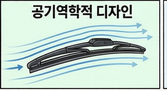 플랫형 와이퍼: 공기역학적 디자인으로 고속 주행에 강하지만 양 끝이 들뜰 수 있음
