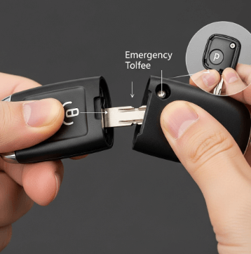 스마트키 측면에 있는 작은 버튼을 누르면서 내장된 비상 키(금속 열쇠)를 빼냅니다.