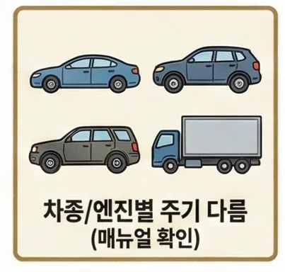 네, 차종과 엔진 종류에 따라 달라요. 디젤은 가솔린보다 짧은 편이고, LPG는 더 자주 교체해야 해요. 반드시 차량 매뉴얼을 확인하세요.