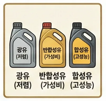 엔진오일은 크게 광유, 반합성유, 합성유로 나뉘어요. 가격도 다르고 성능도 달라서 내 차에 맞는 걸 선택하는 게 중요해요.