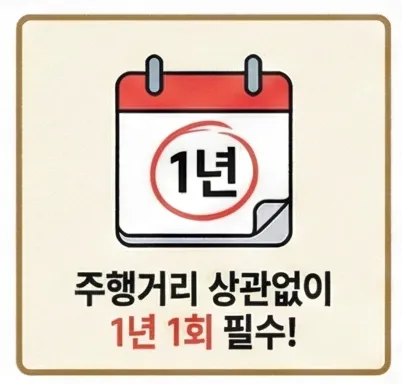 주행거리를 채우지 않았더라도 1년에 1회는 반드시 교체하세요. 오일은 주입하는 순간부터 산화가 시작되기 때문이에요.