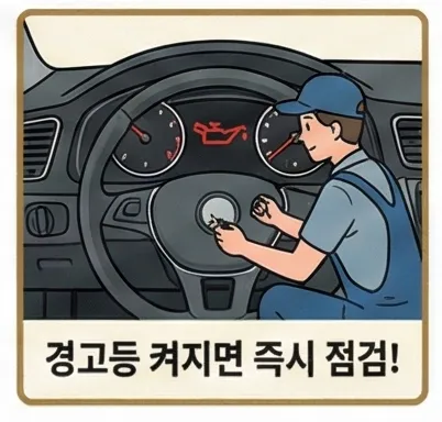 경고등이 켜졌다면 오일이 부족하거나 압력에 문제가 생긴 거예요. 즉시 주행을 멈추고 레벨을 확인한 뒤, 가까운 정비소로 가세요.