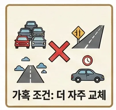 한국 도로 환경은 대부분 가혹 조건에 해당해요. 다음 중 하나라도 해당되면 권장 주기보다 빨리 교체하세요.