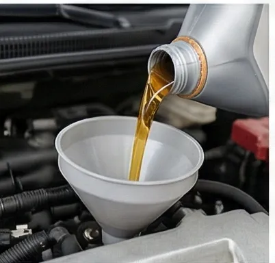 깔때기를 오일 주입구에 끼우고 **조금씩** 엔진오일을 부어줍니다. 한 번에 많은 양을 넣지 말고 200~300ml씩 나눠서 주입하는 것이 안전합니다.