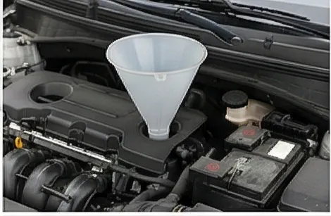 깔때기를 이용해 차량 매뉴얼에 명시된 규격의 오일을 천천히 부어줍니다