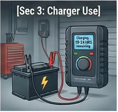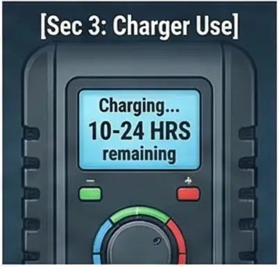 심하게 방전된 배터리(12.2V 이하)는 충전기로 10~24시간 정도 걸립니다.