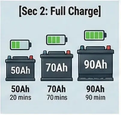 주행 중에는 시간당 약 10~15암페어씩 충전된다고 보시면 돼요. 공회전은 이보다 1.5배 정도 더 오래 걸립니다.