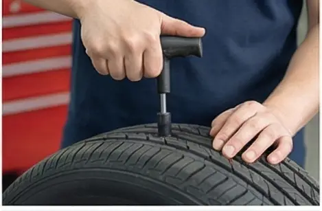 가장 흔한 수리 방법은 '지렁이'라고 불리는 고무 심지를 이용한 펑크 수리입니다. 못이 박힌 작은 구멍에 끈끈한 고무를 넣어 막는 방식이죠.