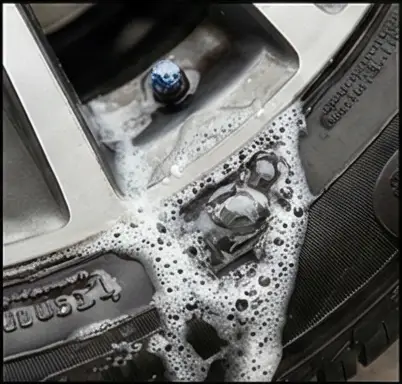타이어에 공기를 주입한 후 비눗물이나 워셔액을 뿌려 기포가 나오는 곳을 찾습니다. 못이나 나사가 박혀 있다면 위치를 기억하세요.