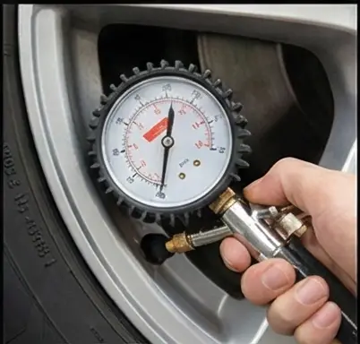 타이어 권장 공기압(보통 32~35psi)까지 공기를 주입합니다. 차량 매뉴얼이나 운전석 문 안쪽에서 확인할 수 있어요.